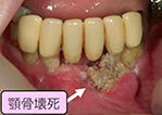 骨粗鬆症になるとビスフォスフォネートなど骨の吸収をおさえる薬を処方されることがあります。 この薬の服用中に,歯周病や抜歯した部位などから細菌感染が起こると, 骨が化膿したり,腐骨化してまれに顎骨壊死や顎骨骨髄炎になることがあるため,かかりつけ歯科でお口の管理をしてもらうことが大切です。